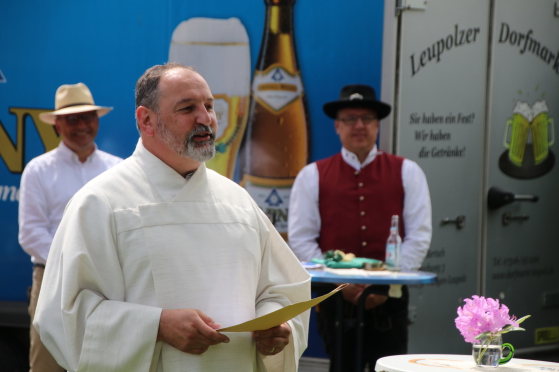 Bürgermeister Dieter Krattenmacher ging in seiner Ansprache auf die 15 Jahre andauernden Gespräche und verschiedenen Ideen zur Gestaltung einer neuen Vereinsheimat ein. Mit dem Projekt des Musikvereines wurden im Gemeinderat die Förderungen im energetischen Bereich neu diskutiert und somit auch eine neue Basis für sämtliche Vereine geschaffen. Als Geschenk übergab er das Wappen der Gemeinde in Form einer Bleiverglasung, welches seinen Platz im Vereinsheim finden und an die Unterstützung der Gemeinde erinnern wird. Stephan Wiltsche als Vertreter der katholischen Kirchengemeinde nahm mit treffenden Bibelzeilen Bezug zum Bau und zur Musik. Nach dem gemeinsamen Gebet segnete Wiltsche die Räumlichkeiten und die Anwesenden.